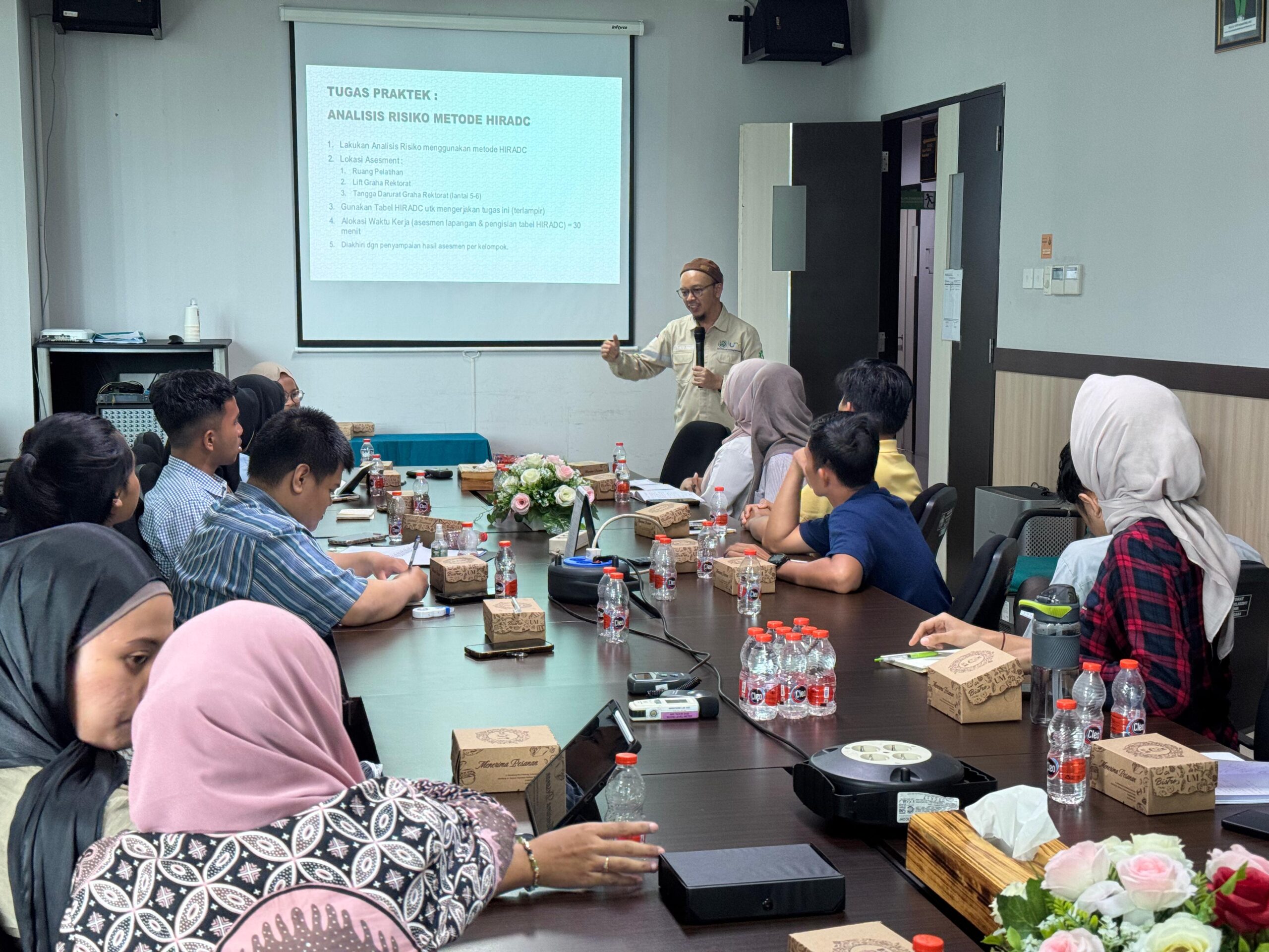 Pada sesi kedua, dr. Erianto menjelaskan metode HIRADC (Hazard Identification, Risk Assessment, Determining Control), yang merupakan alat penting dalam melakukan analisis resiko. Metode ini mengajarkan peserta cara mengidentifikasi bahaya, menilai resiko yang mungkin timbul, serta menentukan langkah-langkah pengendalian yang perlu diterapkan untuk meminimalisir resiko tersebut.