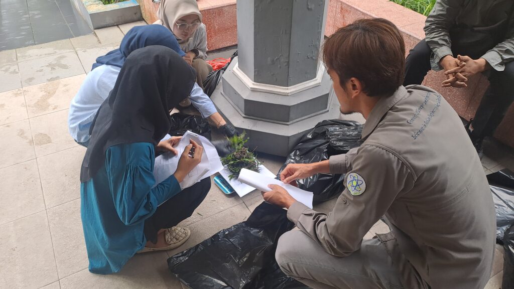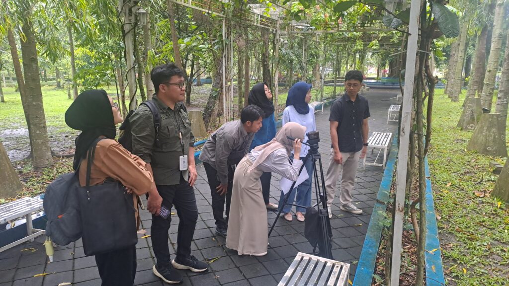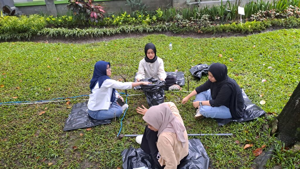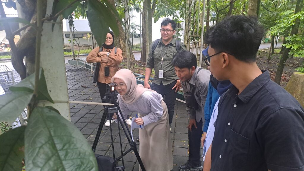 Sesi praktik lapangan dilaksanakan di area hijau kampus sekitar Perpustakaan UM. Peserta melakukan pengukuran diameter batang pohon, identifikasi spesies vegetasi, serta estimasi cadangan karbon di atas permukaan tanah. Melalui kegiatan ini, peserta mempraktikkan metode ilmiah dalam menduga kapasitas serapan karbon vegetasi menggunakan model alometrik.