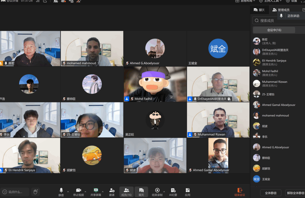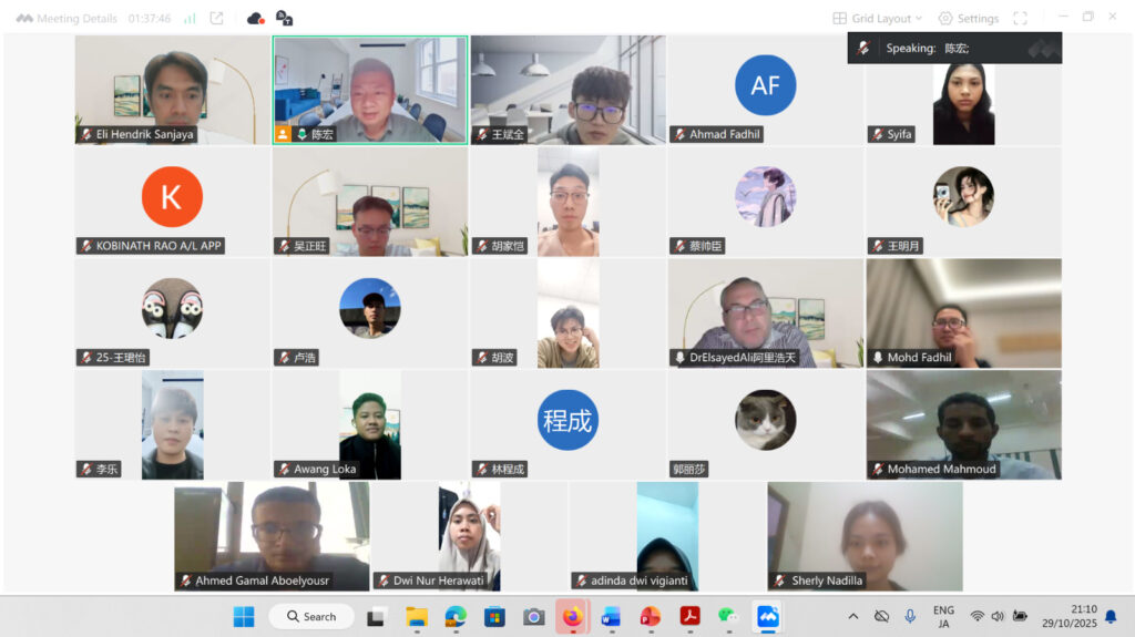Setiap malam, tepat pukul 19.00–21.00 WIB, pembicara lintas negara—China, Indonesia, Malaysia, dan Mesir—bergiliran menyampaikan materi, sementara CSUST bertindak sebagai tuan rumah. Rangkaian sesi dua jam ini memunculkan suasana belajar yang mengalir seperti jembatan cahaya antara benua, mempertemukan perspektif dan pengalaman dari berbagai latar belakang keilmuan.