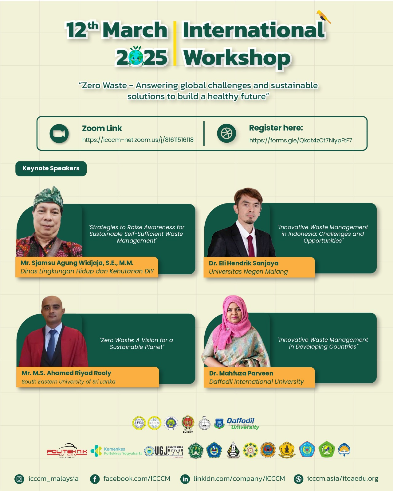 • Mr. M.S. Ahamed Riyad Rooly (South Eastern University of Sri Lanka) menyampaikan materi berjudul “Zero Waste: A Vision for a Sustainable Planet”. Ia menjelaskan konsep ekonomi sirkular sebagai solusi utama dalam mengurangi dampak limbah terhadap lingkungan, serta memberikan contoh implementasi sukses di Sri Lanka.